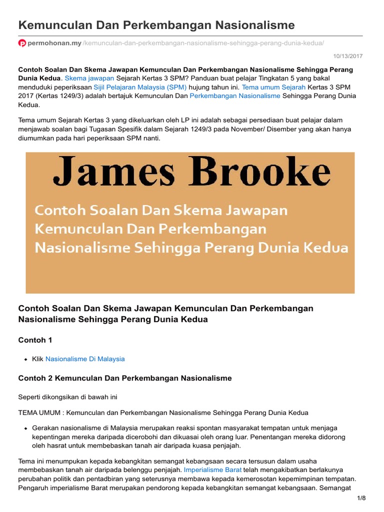Spesifik hanya akan diumumkan pada hari peperiksaan iaitu pada Khamis 9 November 2017. Contoh Jawapan Kemunculan Dan Perkembangan Nasionalisme Sehingga Perang Dunia Kedua. Kemunculan dan Perkembangan Nasionalisme Sehingga Perang Dunia Kedua Gerakan nasionalisme di Malaysia merupakan reaksi spontan masyarakat tempatan untuk menjaga kepentingan mereka daripada dicerobohi dan dikuasai oleh orang luar.